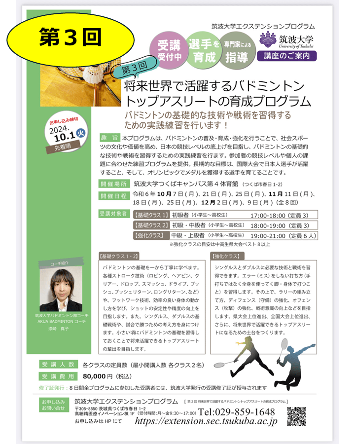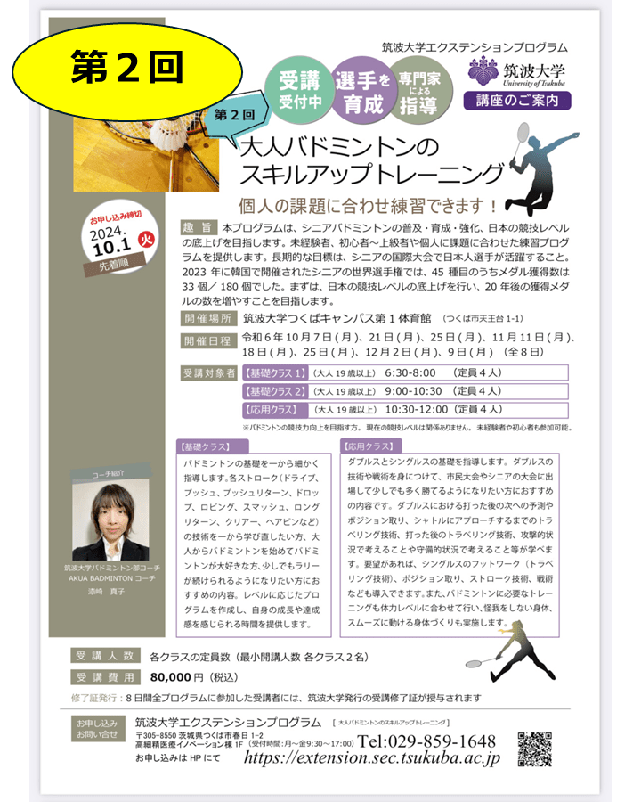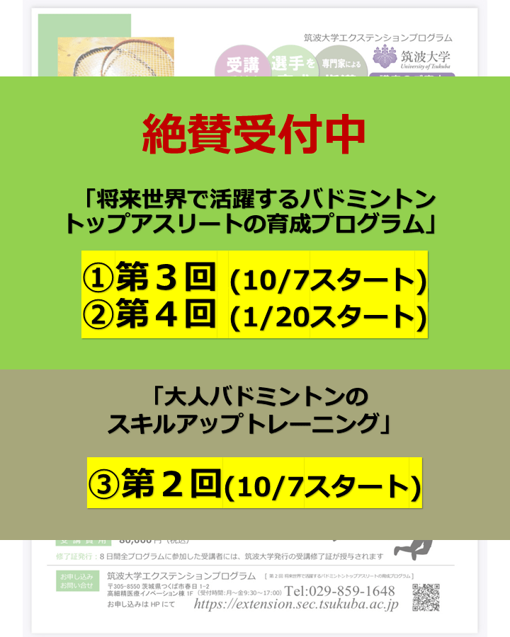 筑波大学エクステンションプログラム、少人数制のレッスン実施しています🏸
