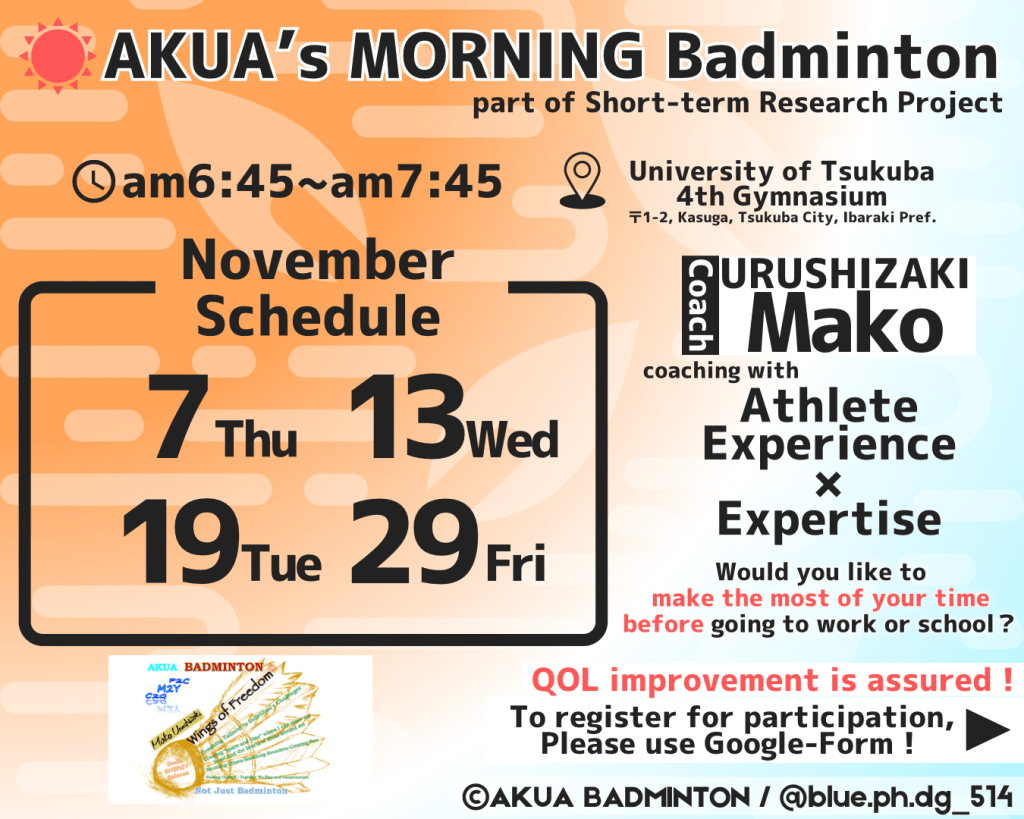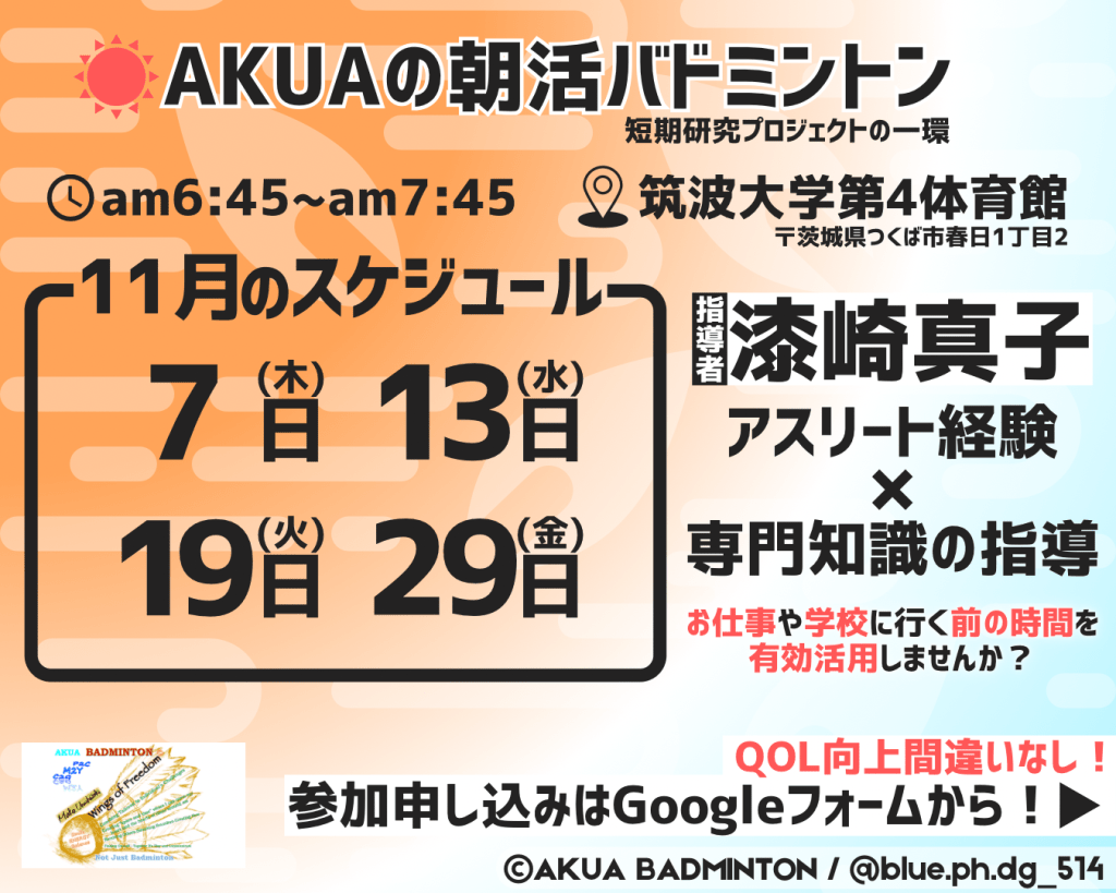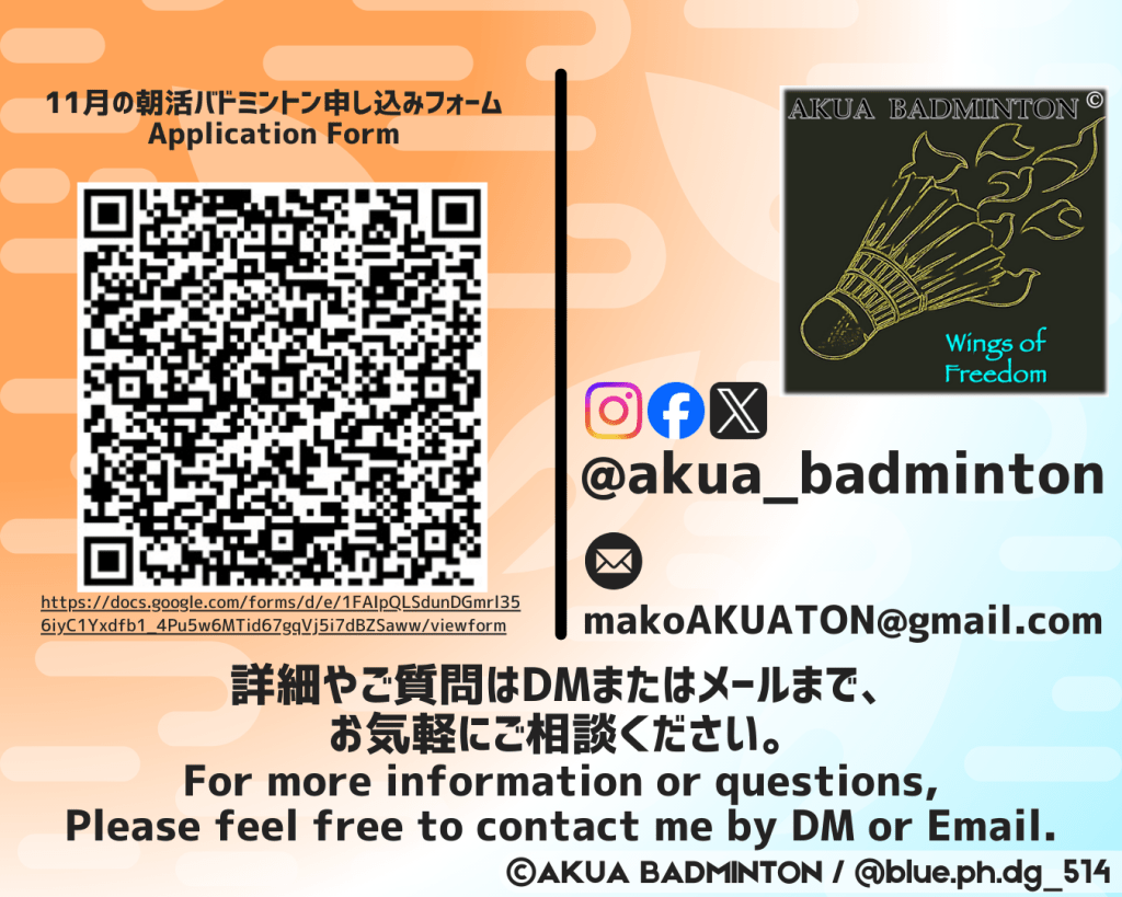 11月の朝活バドミントン🏸寒くなってきましたが、11月もやっています!!ぜひご参加ください💪11月の申し込みリンク!