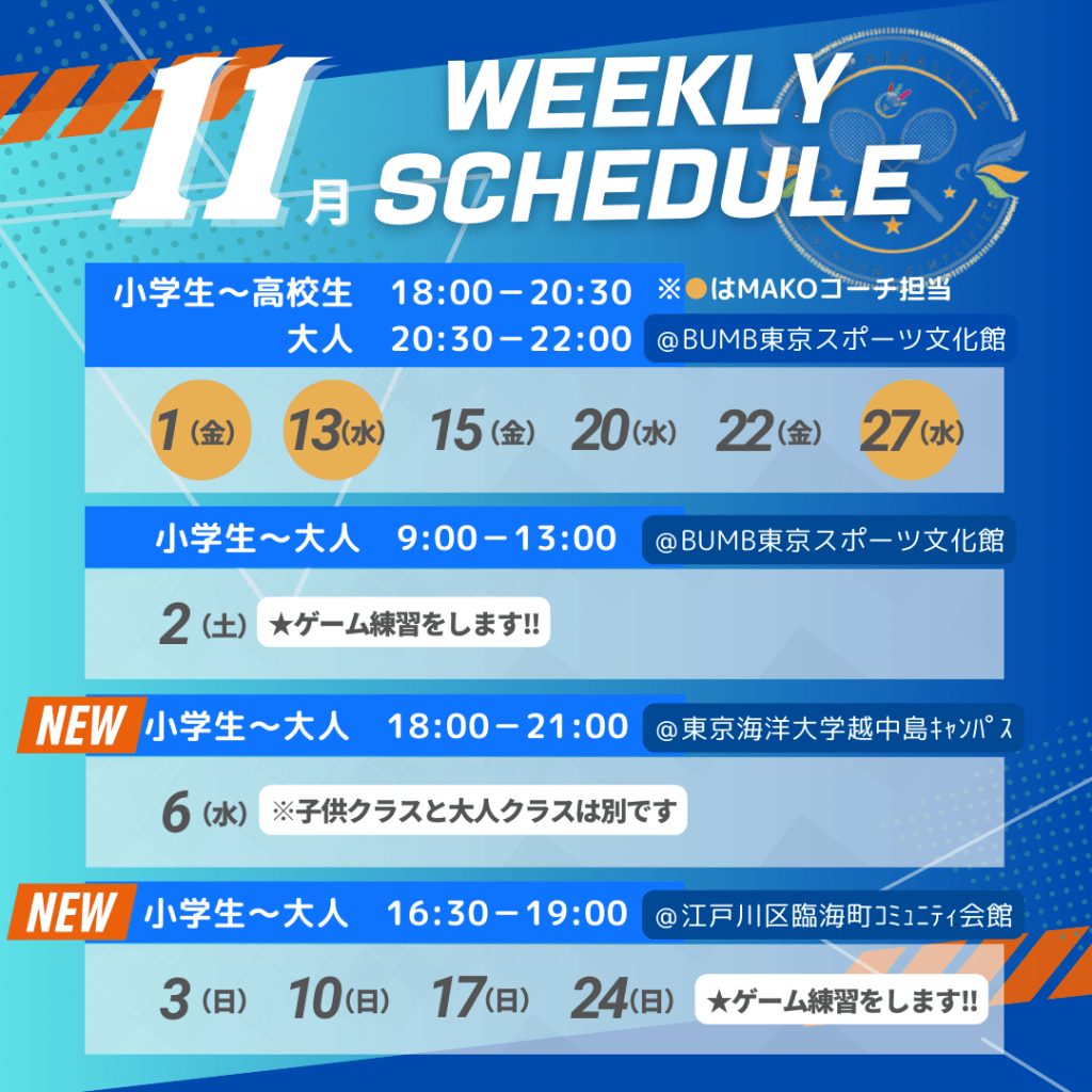 11月もやっています!・土日はゲーム練習のみとなっております。・体験も可能ですので、ご連絡下さい!・その他、質問や気になることがありましたら、お気軽にご相談下さい(makoakuaton@gmail.com)