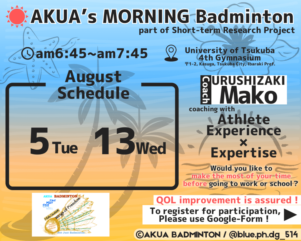 関東を拠点にバドミントン指導を行っています。コーチングスタッフは元実業団選手(日本代表経験あり)、指導では全日本インカレ優勝や日本代表選手輩出などの実績を持つ漆崎真子。筑波大学で培ったコーチングの専門知識を兼ね備えた根拠あるグッドコーチングを武器に、ジュニア指導、部活動指導、社会人指導、シニア指導、レディース指導、パラアスリート指導、留学生指導などオールマイティな指導を提供しています。詳細は右上のメニュー「メッセージ」「コーチの紹介」「AKUA BADMINTONについて」「出張レッスン【料金一覧】」からご覧下さい。