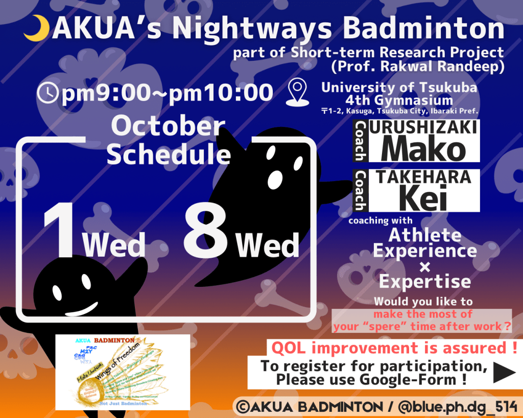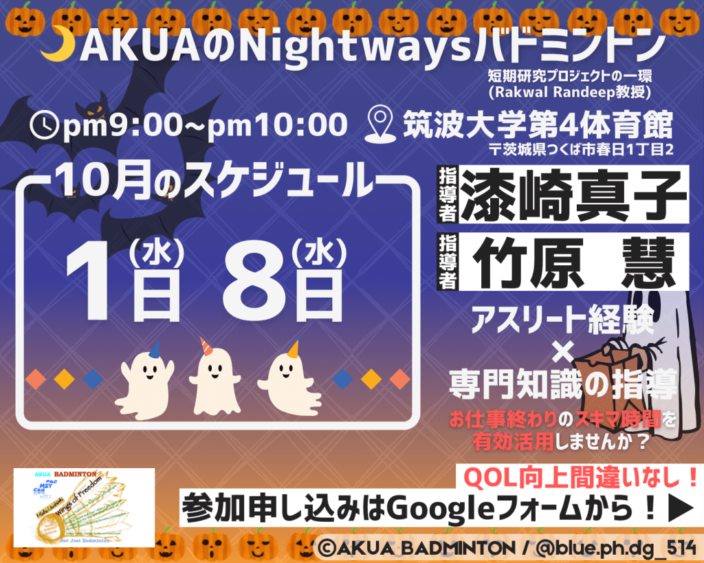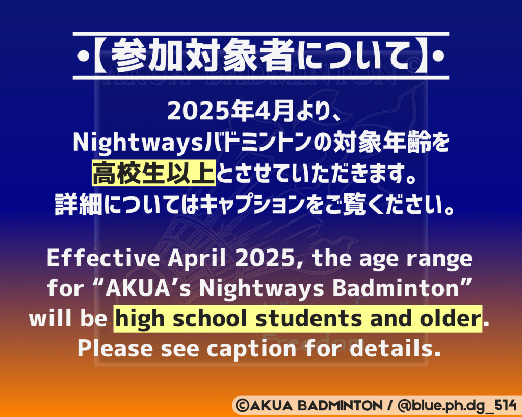 4月より、NightWaysバドミントン(21:00-22:00)の対象年齢を変更し、小学生・中学生の参加をご遠慮いただくことになりました。