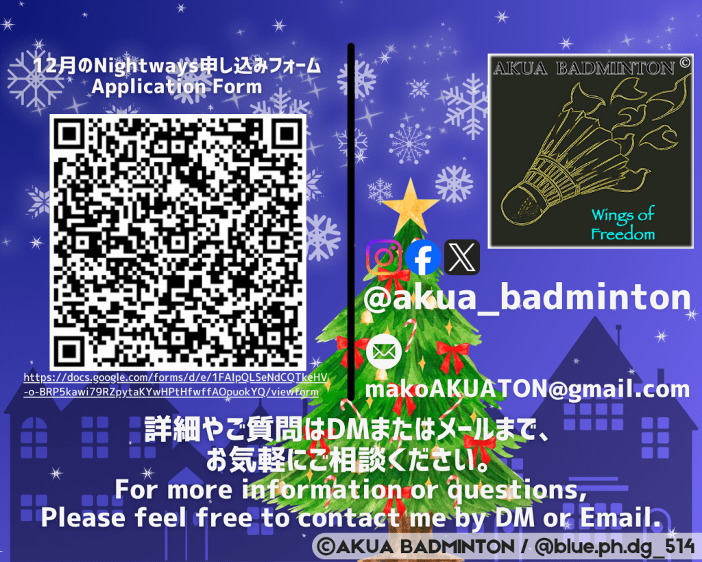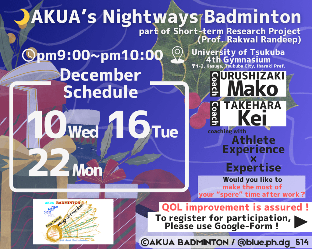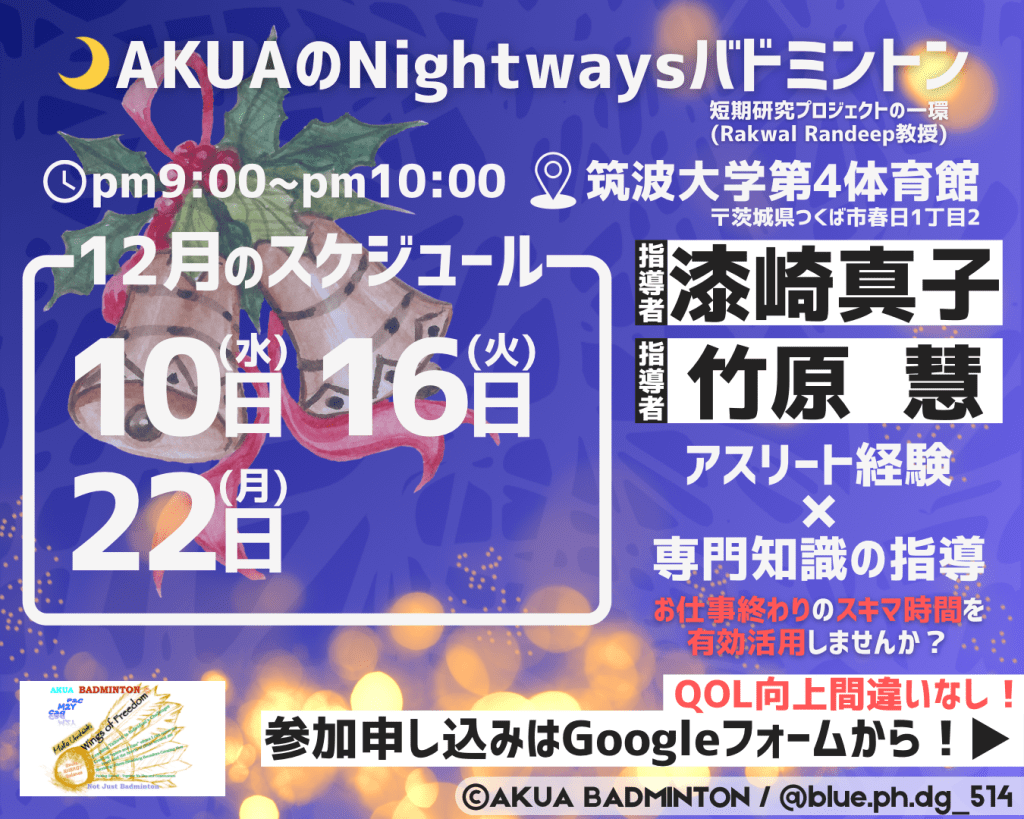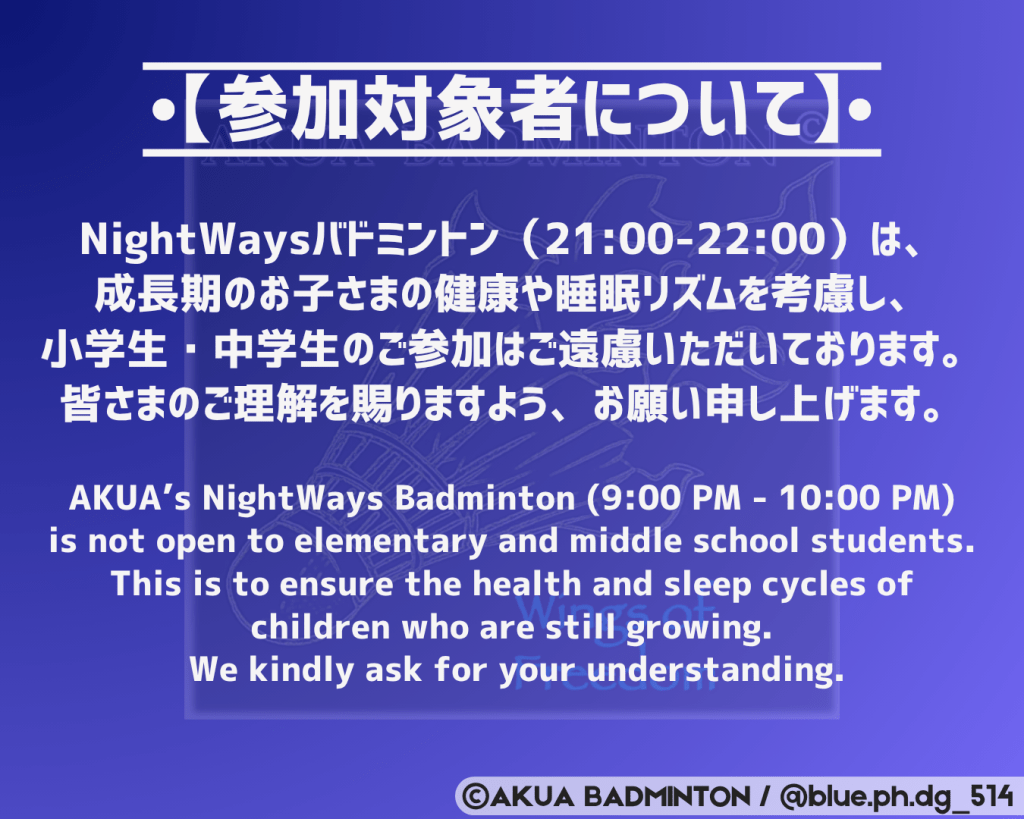 NightWaysバドミントン(21:00-22:00)は、成長期のお子さまの健康や睡眠リズムを考慮し、小学生・中学生のご参加はご遠慮いただいております。