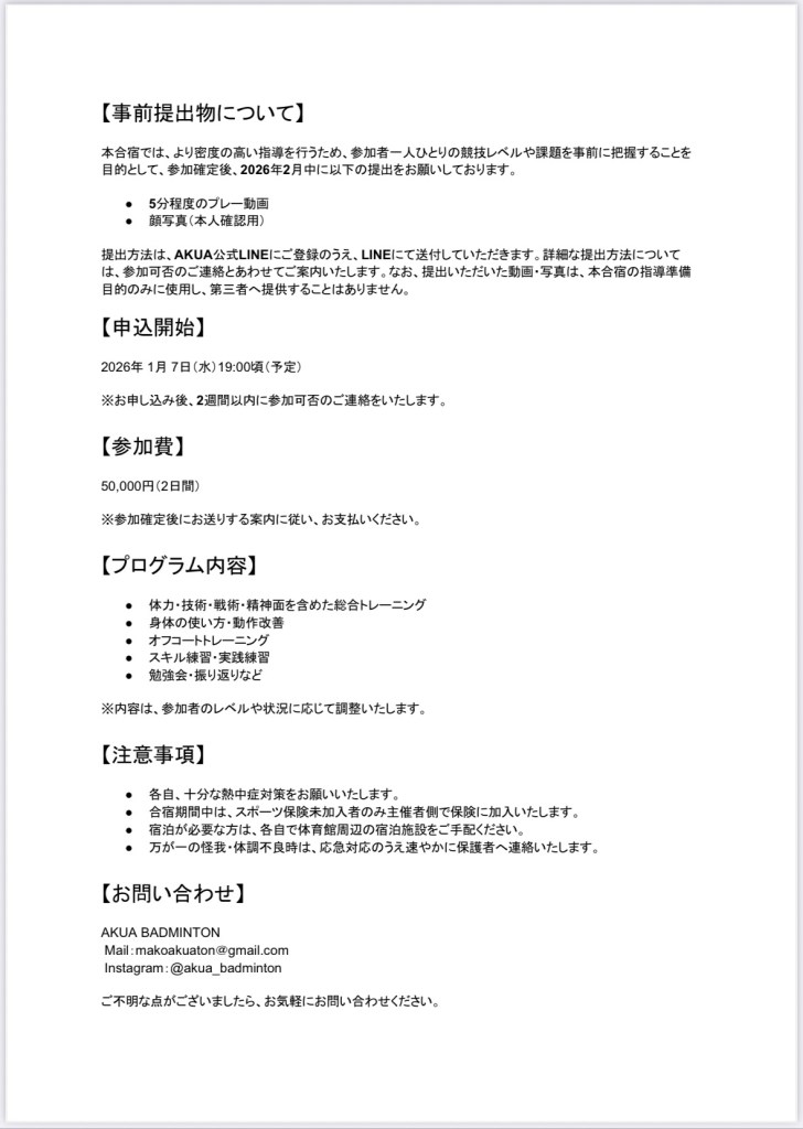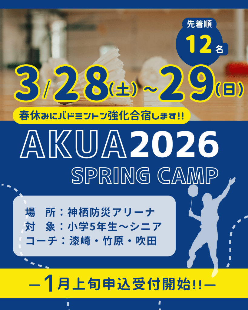 本合宿「AKUAの強化合宿 SPRING CAMP 2026」は、AKUA BADMINTONが主催する、全国の小学5年生からシニア世代までを対象とした少人数制による密度の高い指導を行う強化合宿です。