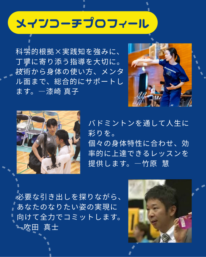 短期間での変化だけでなく、今後の競技人生につながる“考え方・取り組み方”を持ち帰ることを目的としています。集中した環境で、バドミントンに本気で向き合う数日間を共に過ごしましょう。